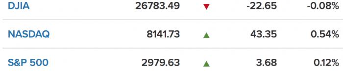 美东时间7月10日周二,市场正静待美联储主席鲍威尔发表的国会证词,投资者情绪谨慎,美股涨跌不一,其中道指连续第三个交易日收跌。截止至北京时间7月10日04:00收盘,道琼斯工业平均指数跌0.08%,报26783.49点;纳斯达克综合指数涨0.54%,报8141.73点;标普500指数涨0.12%,报2979.63点。