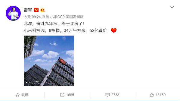 7月10日,小米公司创始人雷军发布微博感慨道:“北漂,奋斗九年多,终于买房了!”。雷军所说的“房”,实际上是小米的新园区,据他介绍,小米科技园总共有8栋楼,占地34万平方米,总造价达52亿元。