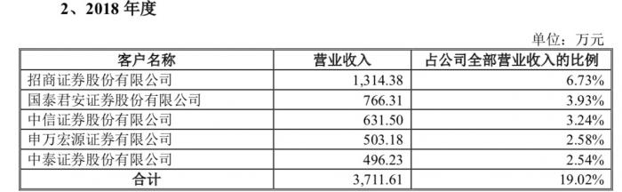 公司的绝大部分收入来源于国内证券公司等机构客户,2018年第一大客户就是招商证券,带来收入1314.38万元,占比6.73%,远远超过其他客户。