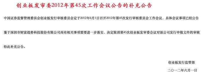 2012年6月1日,中国证监会发布公告称,鉴于深圳市财富趋势有相关事项需进一步核实,决定取消审核其IPO申请。