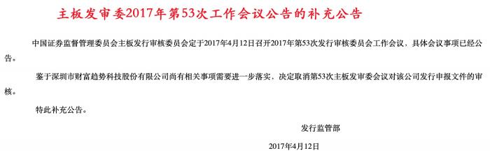 2017年4月12日,中国证监会发布公告称,鉴于深圳市财富趋势科技股份有限公司尚有相关事项需要进一步落实,决定取消第53次主板发审委会议对该公司发行申报文件的审核。