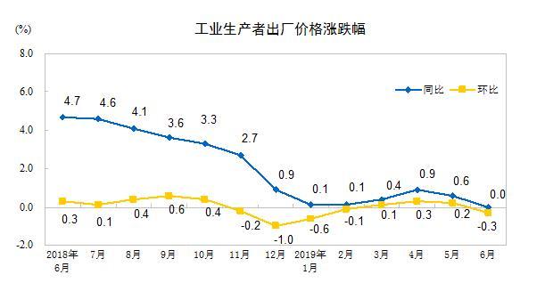 2019年6月份,全国工业生产者出厂价格同比持平,环比下降0.3%;工业生产者购进价格同比下降0.3%,环比下降0.1%。上半年,工业生产者出厂价格比去年同期上涨0.3%,工业生产者购进价格上涨0.1%。