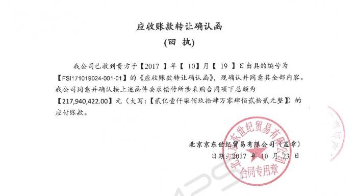最新的一笔登记发生在2019年6月10日,转让标的同样是广东承兴控股对北京京东世纪贸易有限公司的应收账款债权,金额为2.59亿元。亦有京东的确认函。