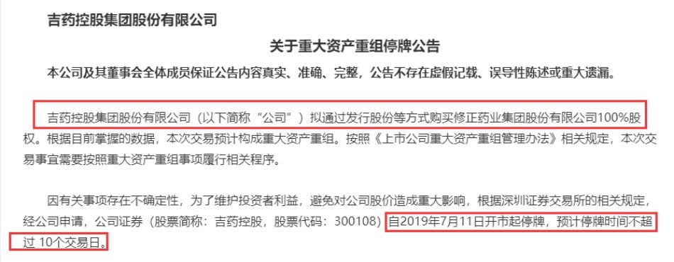 由于本次交易预计构成重大资产重组,吉药控股从7月11日起停牌。