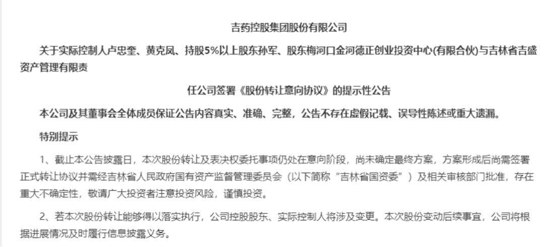 根据公告显示,2019年5月17日,吉药控股的控股股东卢忠奎和黄克凤夫妇,持股5%以上股东孙军和股东梅河口金河德正创业投资中心(有限合伙)的与吉盛资管签署了《股份转让意向协议》,卢忠奎和黄克凤夫妇、孙军和股东梅河口金河德正创业投资中心(有限合伙)同意按照协议拟分别向吉盛资管转让其所持有的吉药控股的部分股份,拟转让股份数量共计1.01亿股,占总股本15.18%。
