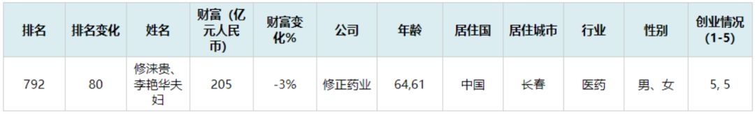 修正药业的不断壮大,让修正药业掌门人修涞贵以55亿元的身家登上《2007胡润百富榜》,成为吉林首富,并多年雄踞吉林富豪榜第一名。2019年,修涞贵、李艳华夫妇以205亿元的身家位列全球富豪榜的792名。