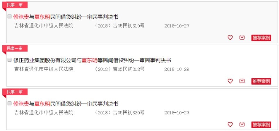 2018年10月29日,中国裁判文书网公布了三起民间借贷纠纷判决书,修涞贵向夏东明讨要1615万借款本金和100万借款利息;修涞贵向夏东明讨要1100万借款本金和60万借款利息;修正药业集团向浙江新联控股讨要3000万借款本金和21万借款利息。
