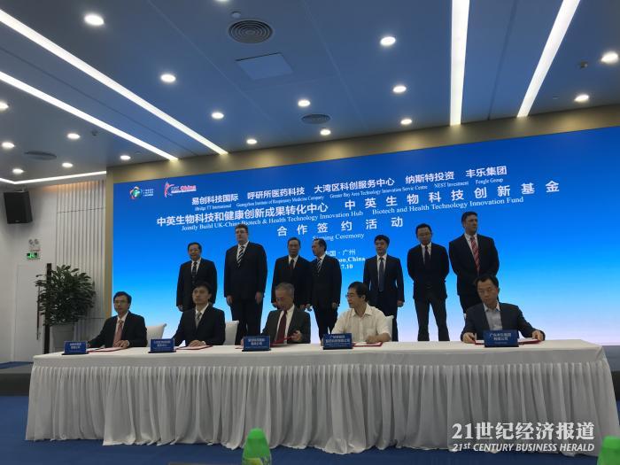 会上,易创科技国际有限公司、广州呼研所医药科技有限公司、纳斯特投资管理公司、粤港澳大湾区科技创新服务中心、丰乐集团公司集中签约,共建中英生物科技和健康创新成果转化中心与中英生物科技创新基金。同时,中英桥华南办公室、中英生物科技和健康创新成果转化中心当天揭牌。