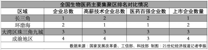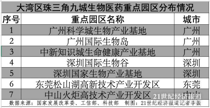 21世纪经济报道记者梳理发现,目前大湾区整体实力位居全国主要生物医药集聚区第3名,企业实力和创新能力排名分列全国第3和第4位。湾区9城共有7个生物医药重点园区,仅广州就占据了其中3席,因此,广州也被视为最具基础、最有条件和潜力培育生物医药成为未来新兴支柱产业的城市。