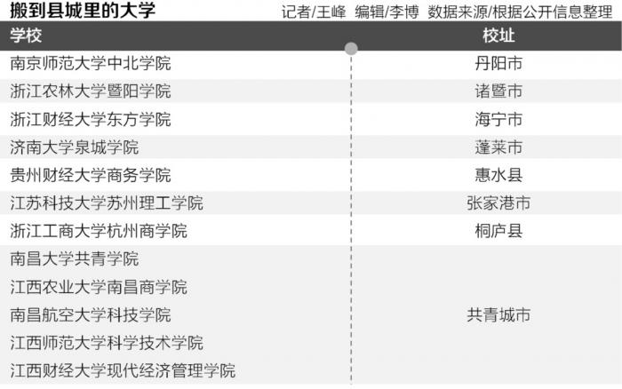 宁波大学教师教育学院副教授周国平统计,截至2017年,超过100所独立学院迁建了校址,其中47所独立学院搬到了县城(有的为县级市,有的在学校选址后撤县设区),在县域办学的独立学院离中心城市的平均距离是69.6公里。