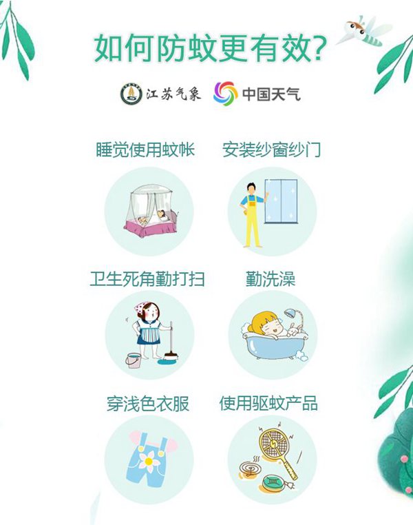 防蚊灭蚊建议“物理”方法为主,“化学”方法为辅。安装纱门、纱窗,清除积水,备上蚊拍,使用杀虫气雾剂、蚊香等都是有效的防蚊方法。中老年人、孕妇、婴幼儿等,建议用电蚊拍、蚊帐等安全系数比较高的灭蚊防蚊工具,减少使用喷雾等“化学”性防蚊用品。蚊子喜好阴暗隐蔽环境,外出活动时需避开蚊子活动的高峰时间,着浅色的宽松衣裤比较容易避开蚊子的叮咬。