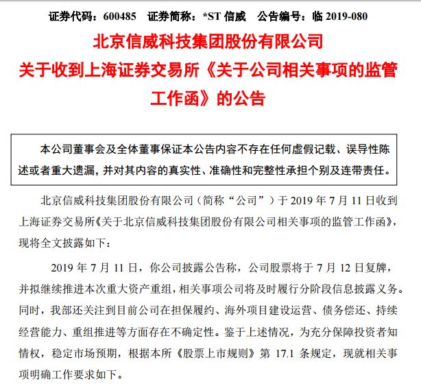 在今日复牌的第一时间,上交所早在昨日下发了监管函,要求ST信威回答以下问题:
