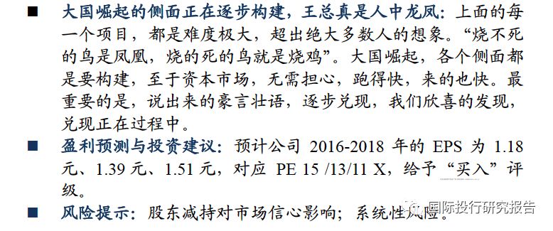 他在报告写到:大国崛起的侧面正在逐步构建,王总真是人中龙凤:上面的每一个项目,都是难度极大,超出绝大多数人的想象。“烧不死的鸟是凤凰,烧的死的鸟就是烧鸡”。大国崛起,各个侧面都是要构建,至于资本市场,无需担心,跑得快,来的也快。最重要的是,说出来的豪言壮语,逐步兑现,欣喜的发现,兑现正在过程中。