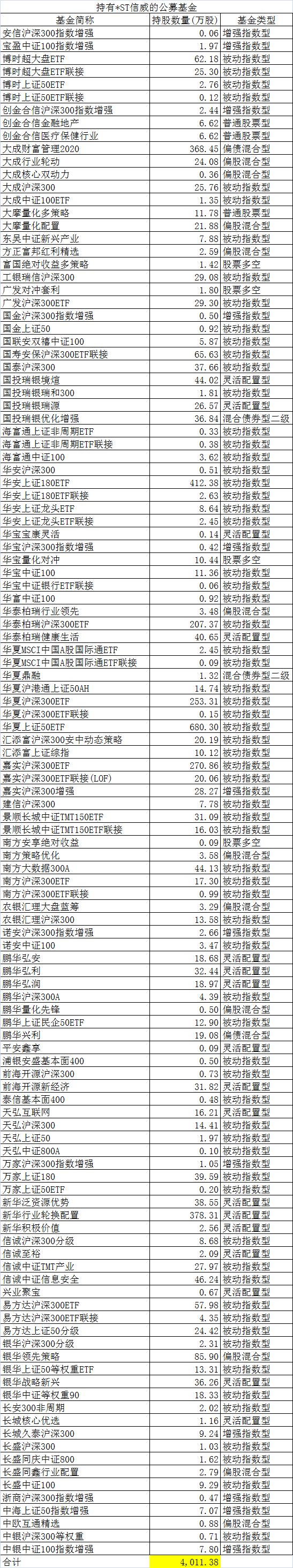 基金年报显示,目前共有119只公募基金持仓*ST信威,合计持股数量4011万股,其中相当比例是指数型基金。