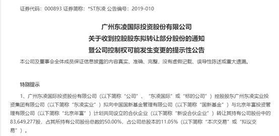 2019年3月26日,*ST东凌发布控股股东拟转让部分股权的公告表示,拟向中国国新基金管理有限公司与北京年富投资管理有限公司计划共同设立的合伙企业转让其持有公司股份中的83,649,277股,占其所持有公司股份总数的50.00%,占公司总股本的11.05%
