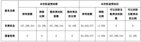 *ST东凌表示本次交易完成后,国富投资将持有公司股份83,649,277股,占公司总股本的11.05%,在公司可以实际支配表决权的股份数量将达到167,298,544股,占公司总股本的22.10%,国富投资将成为公司单一可以实际支配表决权股份数量最大的股东,公司控制权将发生变更。