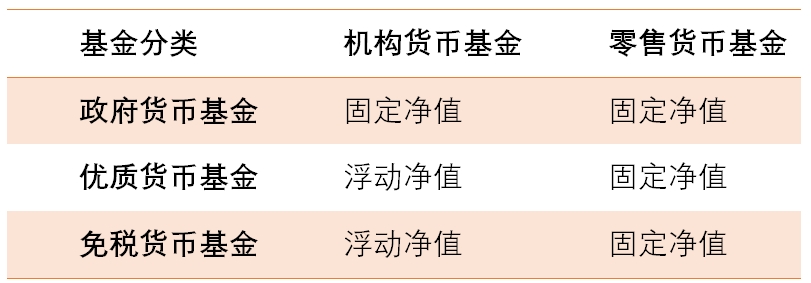 在2014年的货币基金法规的第二次改革中,取消了对货币基金按照浮动净值估值的豁免:机构非政府类货币基金(包括优质货币基金、免税货币基金中的机构型)不允许使用摊余成本法估值,应当采用浮动净值计价,不再维持每单位1美元的固定价格;只有政府货币基金和零售货币基金可以采用固定净值。
