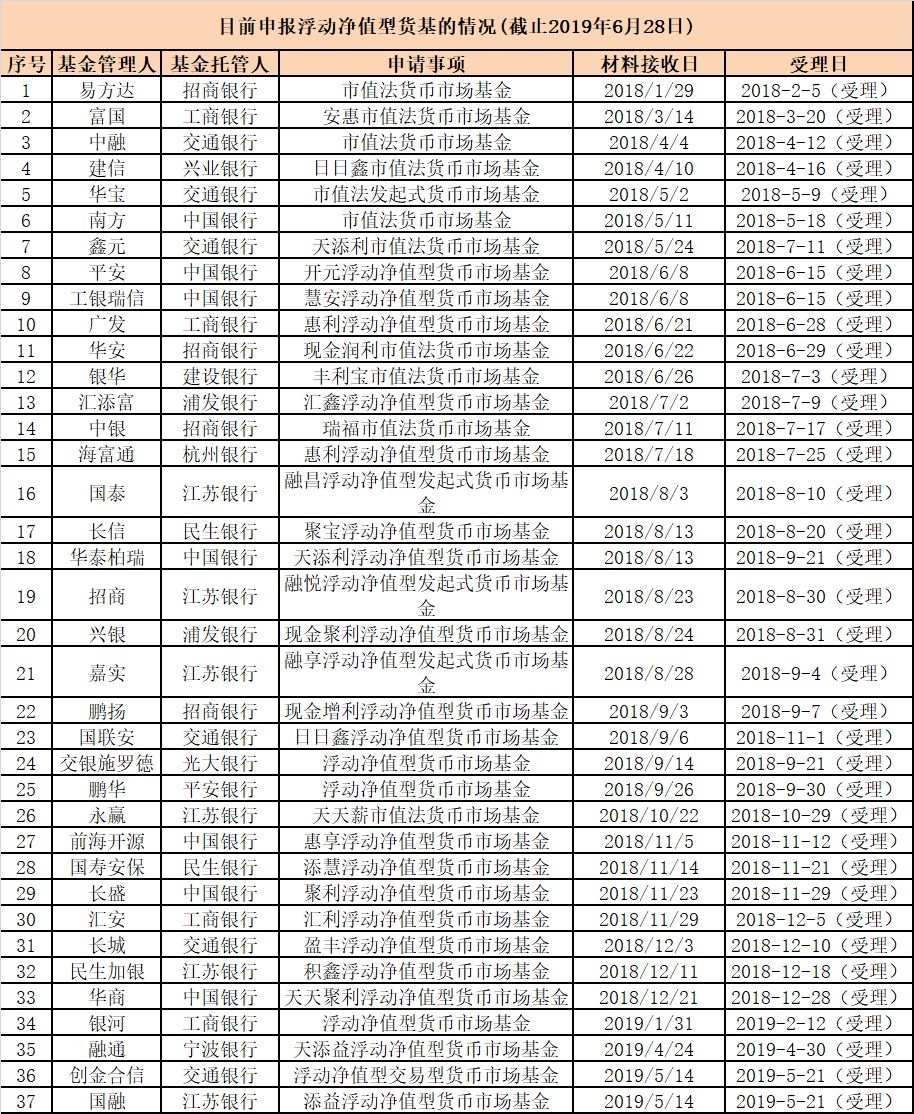 从证监会官网公示的基金募集申请核准进度公示看,自2018年1月底易方达基金首次申报市值法(现统一规范为浮动净值型)货基以来,截至今年6月底,共有40家公募申报了40只货基产品,其中市值法货基申报数量为11只,浮动净值货币型基金申报数量为26只,而市值法货基是浮动净值型货币基金更名前的名称,合计两类基金上报数量大约37只。