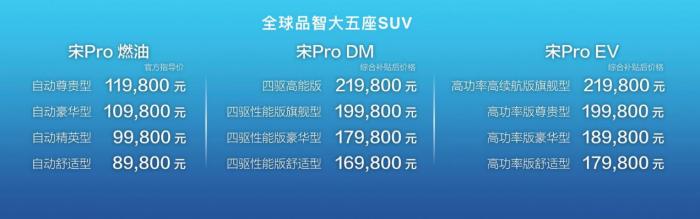 7月11日,比亚迪旗下大五座SUV宋Pro在北京水立方正式上市,新车基于比亚迪宋打造,共推出12款车型,包括燃油、双模、纯电三大动力, 其中宋Pro DM售价区间为16.98-21.98万元,宋Pro EV售价区间为17.98-21.98万元。