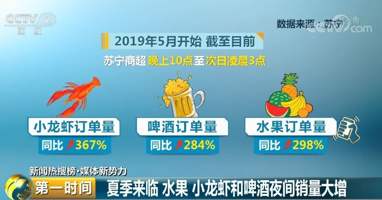 随着夏季的到来,夜间消费逐渐火爆。苏宁大数据显示,夏季时令水果、小龙虾、啤酒在夜间乃至凌晨的订单均有不同程度的提高。从今年5月开始,截至目前,苏宁商超晚上10点至次日凌晨3点的小龙虾订单量同比增长367%,啤酒订单量同比增长284%,水果订单量同比增长298%。