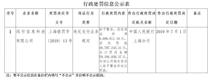 7月12日,央行开出第三方支付行业史上最高金额罚单:迅付信息科技有限公司(简称“环迅支付”)因违反支付业务规定,合计被处罚59,394,056.37元(约5939万元)。