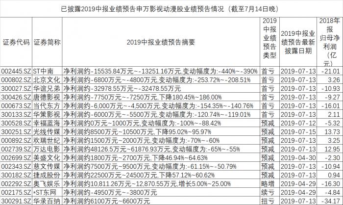 21世纪经济报道记者根据Wind数据统计发现,截至7月14日晚,申万影视动漫行业披露半年报业绩预告的16家上市公司中,6家首亏,1家续亏,7家预减,仅有1家略增,1家扭亏。16家中,预告净利润同比下滑的多达13家,其中7家净利润预计最高下降不少于100%。