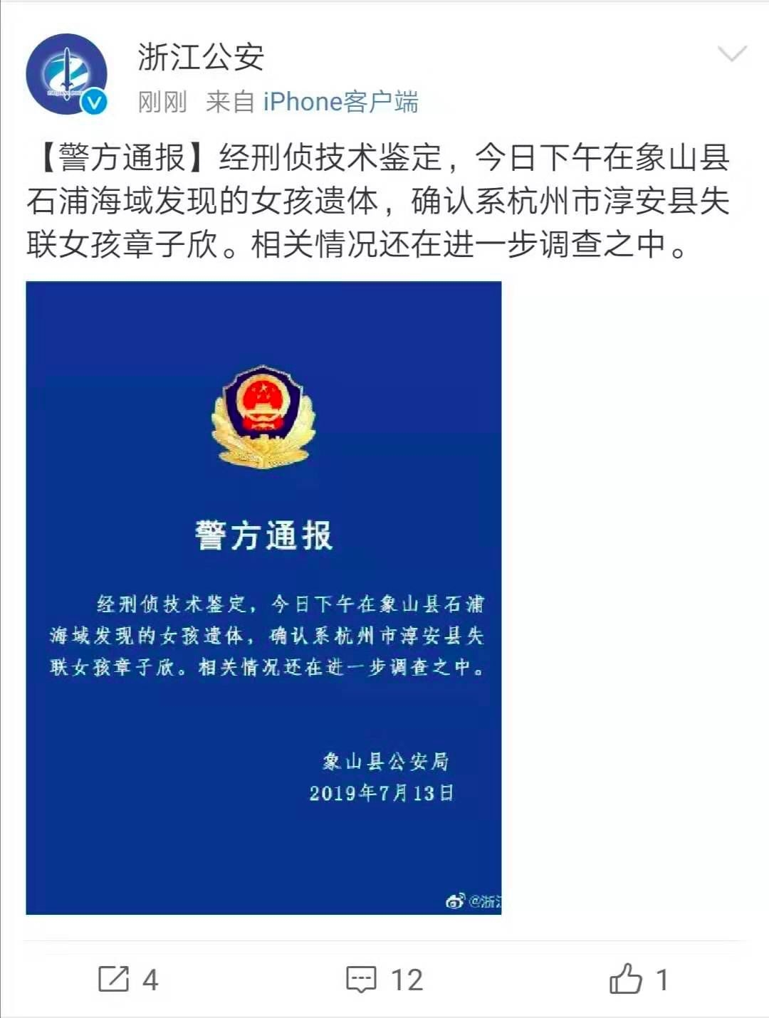 经刑侦技术鉴定,下午在象山县石浦海域发现的女孩遗体,确认系杭州市淳安县失联女孩章子欣。