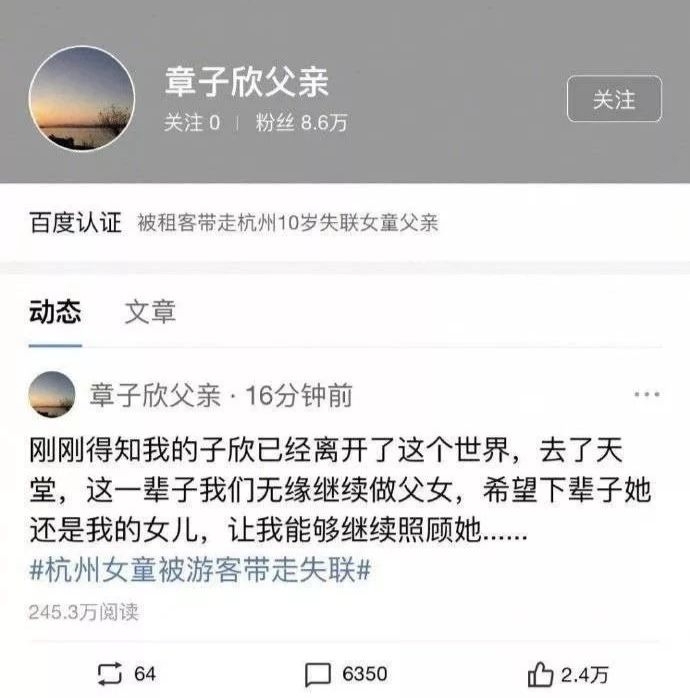 据网友截图显示,一个经认证名为“章子欣父亲”的百度账号,在7月13日下午,警方找到疑似章子欣遗体后,发布了一条动态: