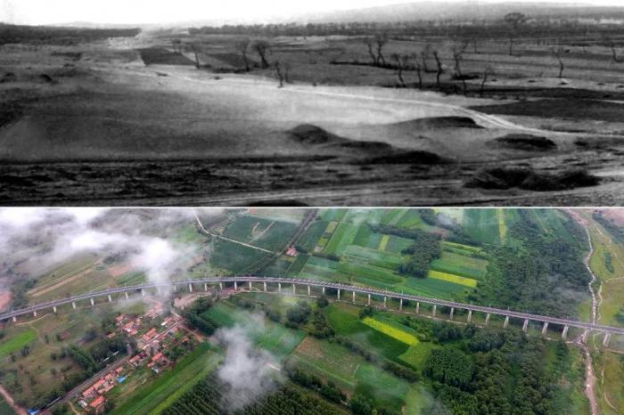 拼版照片:上图为治理前的山西省右玉县右卫镇的景象(资料照片);下图为2017年7月22日拍摄的山西省右玉县右卫镇一带景象(新华社记者 詹彦 摄)。