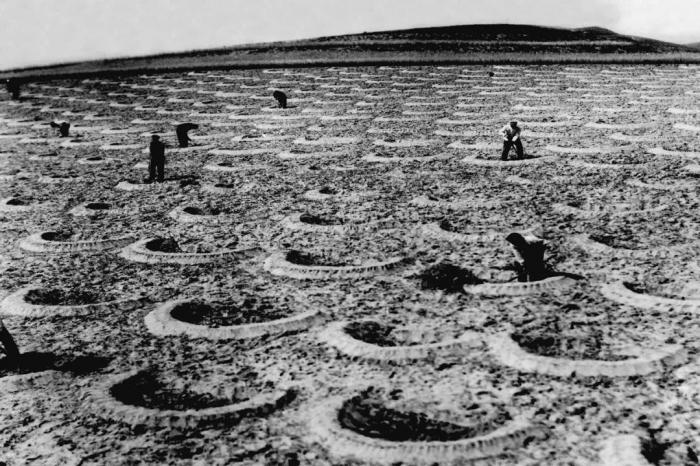 20世纪六七十年代,右玉县群众在荒山荒坡植树(翻拍照片)。新华社发