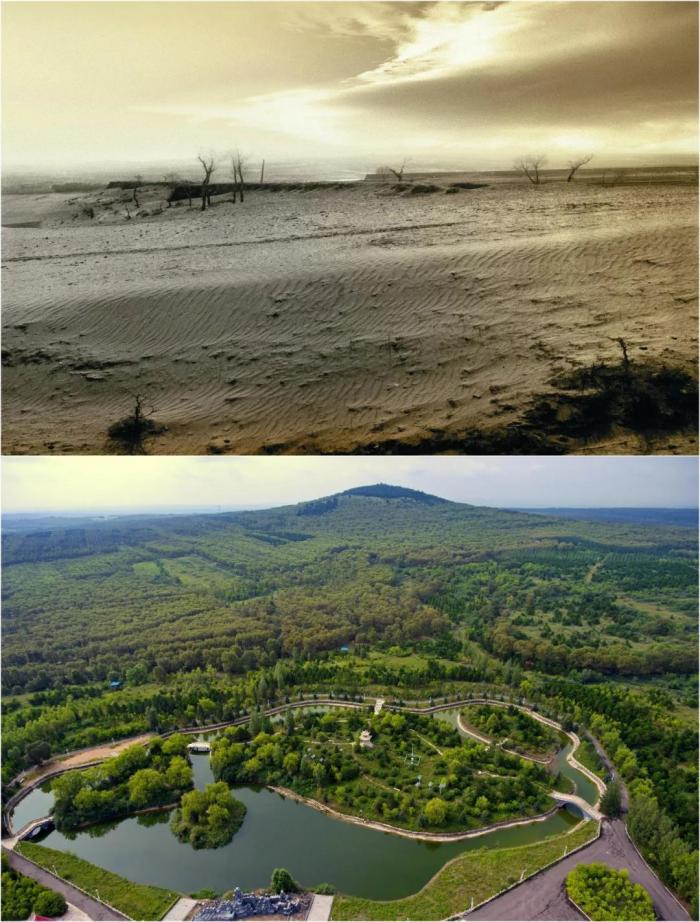 拼版照片:上图为治理前,右玉县的荒凉沙地(资料照片);下图为右玉县小南山森林公园(新华社记者曹阳8月7日摄)。