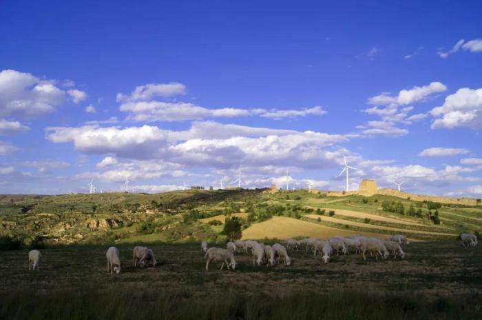 在山西省右玉县小五台风力发电厂附近,当地牧民放养的羊群在吃草(2012年6月12日摄)。新华社记者 燕雁 摄