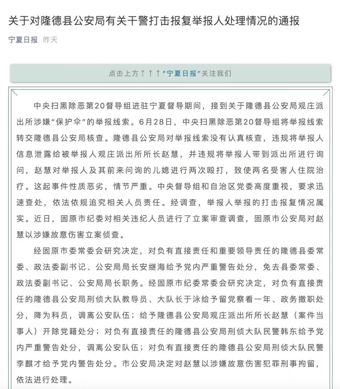 中央扫黑除恶第20督导组进驻宁夏督导期间,接到关于隆德县公安局观庄派出所涉嫌充当“保护伞”的举报线索。6月28日,中央扫黑除恶第20督导组将举报线索转交隆德县公安局核查。隆德县公安局对举报线索没有认真核查,违规将举报人信息泄露给被举报人观庄派出所所长赵慧,并违规将举报人带到派出所进行询问,赵慧对举报人及其前来问询的儿媳进行两次殴打,致使两名受害人住院治疗。这起事件性质恶劣,情节严重。中央督导组和自治区党委要求迅速查处,依法依规追究相关人员责任。