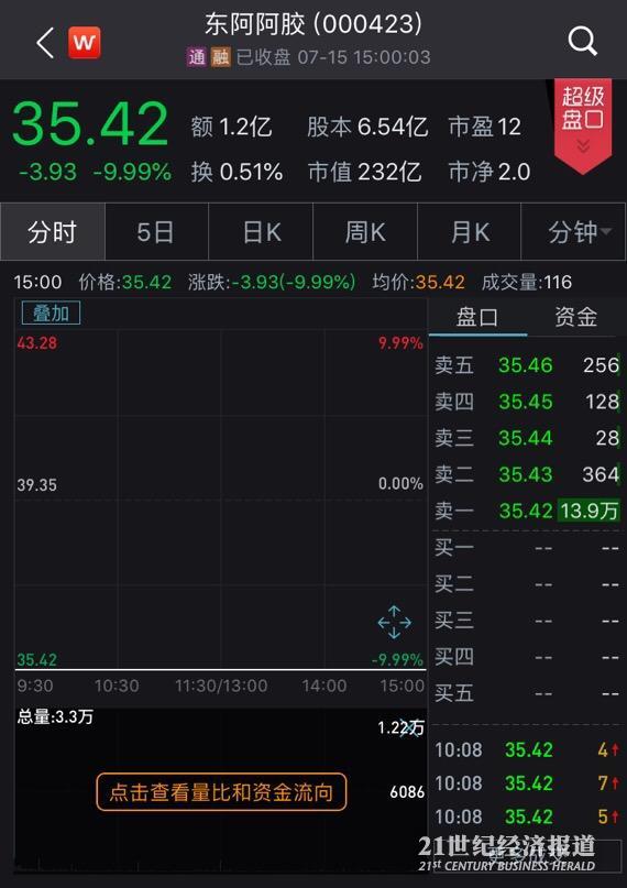 7月15日,东阿阿胶开盘便一字封死在跌停板,截至收盘,跌停价上尚有近14万手卖单未能出逃。