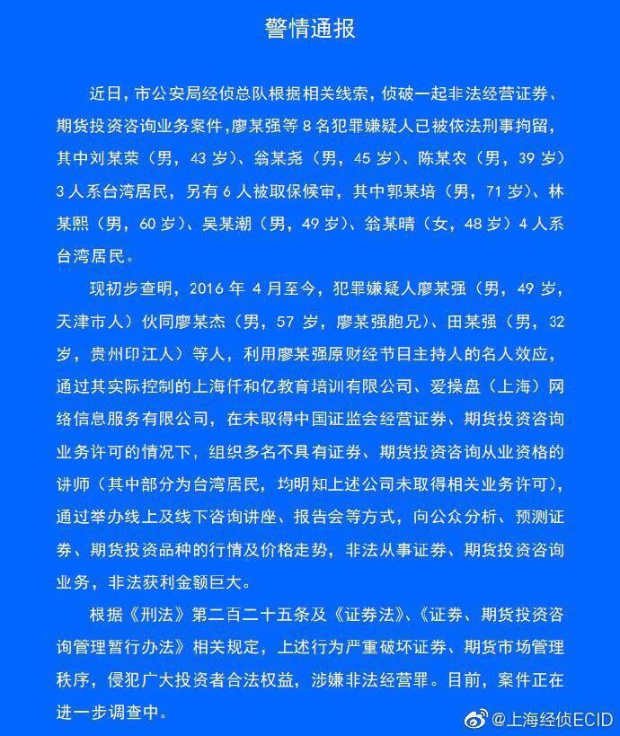 近日,上海市公安局经侦总队根据相关线索,侦破一起非法经营证券、期货投资咨询业务案件,廖某强等8名犯罪嫌疑人已被依法刑事拘留。