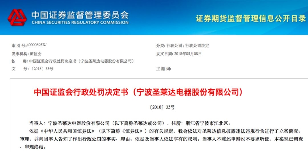 由于在2015年业绩造假,圣莱达此前被证监会立案调查、审理。2018年5月8日,证监会披露了对圣莱达的《行政处罚决定书》。