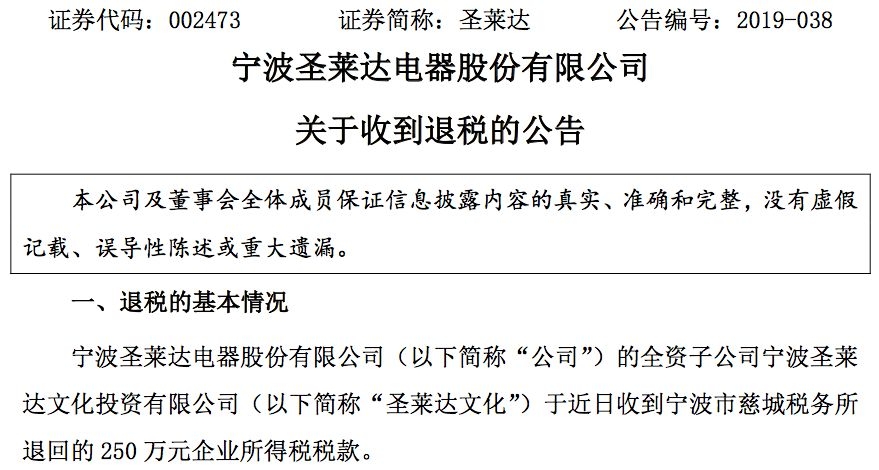 原来,由于之前虚增了收入和利润,因此也就多缴纳了企业所得税。如今,公司把多缴的税要了回来。7月11日,圣莱达发布公告称,中国证监会《行政处罚决定书》认定公司2015年度虚构影视版权转让业务,虚增2015年度收入和利润1000万元,公司已根据《企业会计准则》的要求对上述会计差错进行了更正。经公司申请,慈城税务所于近日退还圣莱达文化已缴纳的所得税税款250万元。