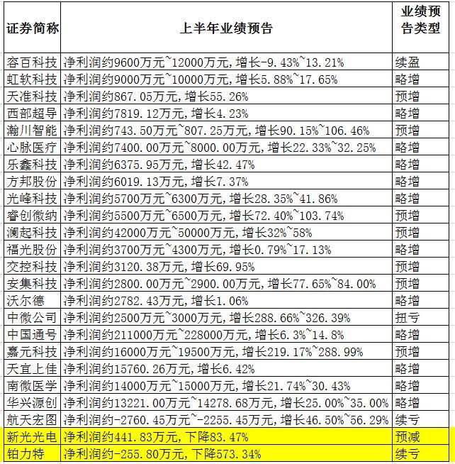 截至7月15日,25家首批科创板企业有24家披露上半年业绩预告,其中22家净利同比出现上涨,只有新光光电、铂力特出现了业绩下滑。尤其是铂力特,预计上半年仅实现净利润-255.80万元,同比下滑573.34%。