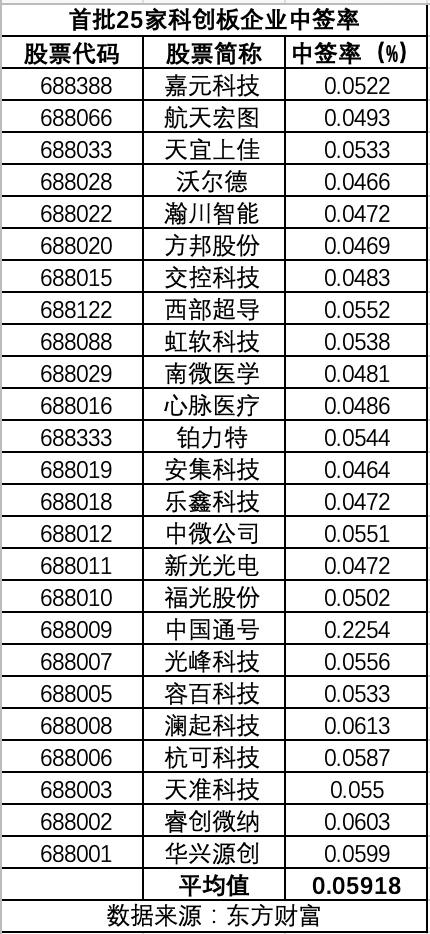 数据显示,科创板首批25家企业的平均中签率为0.05918%,比A股中签率要略低。根据21世纪经济报道记者对Wind数据进行统计,上半年64只新股平均中签率为0.06640%。
