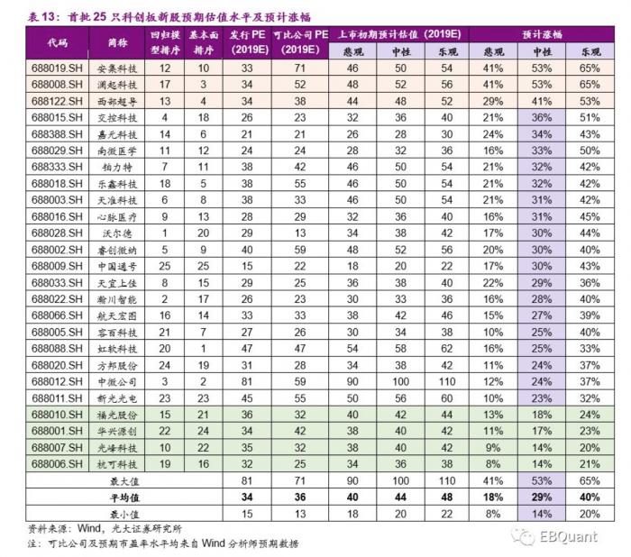 中性假设下,科创板首批25只新股的平均涨幅为29%,涨幅区间为14%-53%。涨幅靠前的公司是安集科技53%、澜起科技53%、西部超导41%,涨幅靠后的公司是福光股份、华兴源创、光峰科技、杭可科技,均在20%以下。