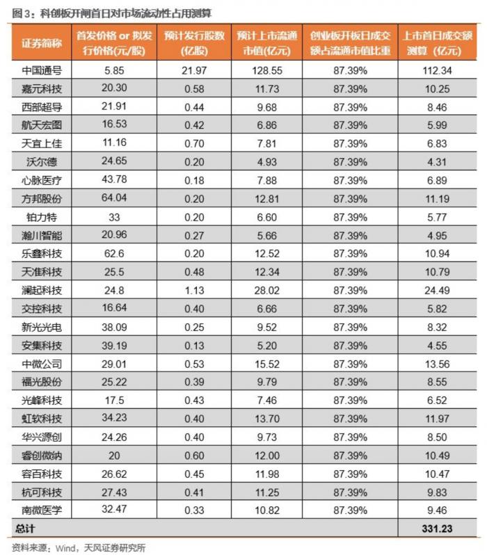 天风证券分析师徐彪:按“科创板上市首日成交额=预计发行价*预计发行股数*87.39%(创业板开板日成交额占流通市值比重)”计算,初步预计,科创板开板首日可形成331.23亿成交额,这部分交易额预计将对存量资金形成一定占用,从而对市场流动性将产生冲击。