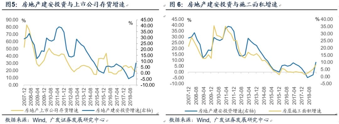 房企上市公司的存货数据包含原材料类存货(建筑原材料)、设备类存货(开发设备)、在产品类存货(在建工程)、产成品类存货(已开发完成的土地、房屋、配套设施等)。2007-2014年,这一指标与房地产建安投资的趋势和拐点大致一致;2015年起存货指标较建安投资具有一定领先性。此外,从历史数据来看建筑投资增速与房屋施工面积始终具有较高的相关性,但2018年增速偏低且是2004年以来的首次全年负增长。我们推测这一现象与2018年房地产投资统计方式向“财务支出法”转变有关,使得房地产建筑投资增速在2018年存在低估,而2019年则可能高估。