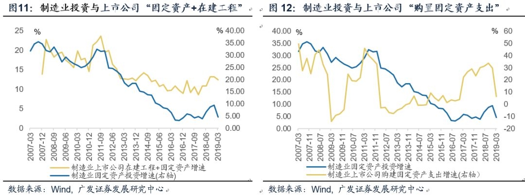 在上市公司数据中,与制造业投资完成额最为相关的是“固定资产+在建工程”指标。由此观察,制造业投资的两个小高峰出现在2007与2011年,2013年上升弹性较低,而2011年之后整体趋势向下,直到2018年才出现了一波产能周期,2019也已拐头向下。