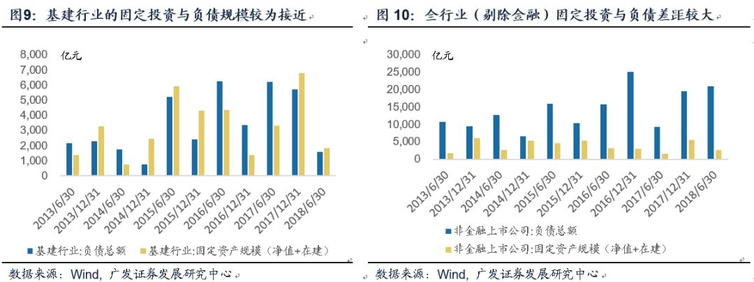 如果从行业特征出发,对于基建行业这样的重资产服务业,原料人工成本等生产经营耗用资金显然不是企业融资资金的主要投向,固定资产投资才是企业融资的最重要用途。从上市公司数据也可以看到,企业融资规模中有相当大的比例用来进行固定资产投资,因此基建投资规模同时也可以用于大致观察全行业负债情况。