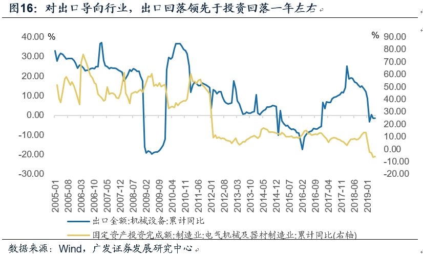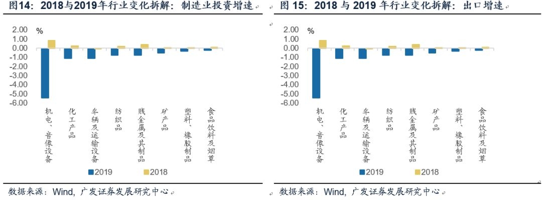 数据显示2018与19年制造业投资与出口增速都分别表现出先升后降的特征,我们在行业层面进行拆解,可以看到制造业投资的回落确实与出口放缓高度相关,但二者之间仍然存在一年左右的时滞。