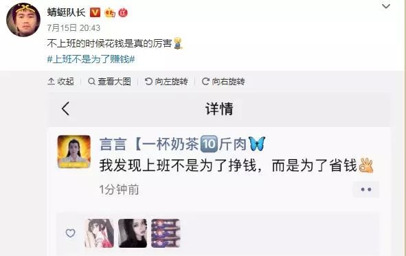 这是一个由博主@蜻蜓队长 一篇博文引发的话题,博主配图截了朋友圈里的一句话“我发现上班不是为了挣钱,而是为了省钱”。