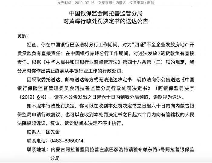 其中一份对黄某处罚措施显示:经查,你在中国银行巴彦浩特分行工作期间,对为“四证”不全企业发放房地产开发贷款负有直接责任;在中国银行赤峰分行工作期间,对违法发放2笔贷款负有直接责任。