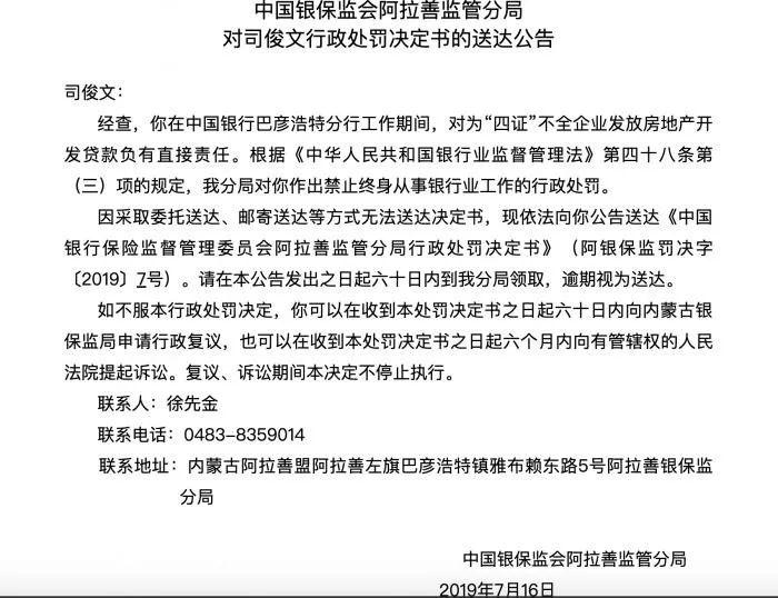 另一份对司某文开出的罚单则称:经查,你在中国银行巴彦浩特分行工作期间,对为“四证”不全企业发放房地产开发贷款负有直接责任。