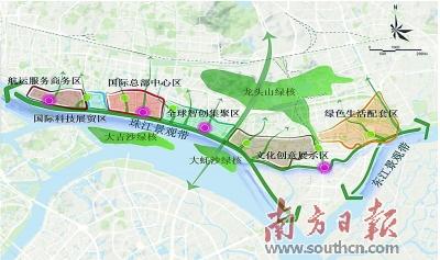 本次规划将形成“两带多廊、生态织补、六区多点、产业联动”的整体结构。“两带多廊、生态织补”,是指保育龙头山、江心岛为主的绿色生态基底,以珠江景观带及东江景观带为统领,多条通江廊道,整合绿地、水脉形成生态网络。“六区多点、产业联动”,是指打造六大分区:航运服务商务区、国际科技展贸区、国际总部中心区、全球智创集聚区、文化创意展示区、绿色生活配套区。