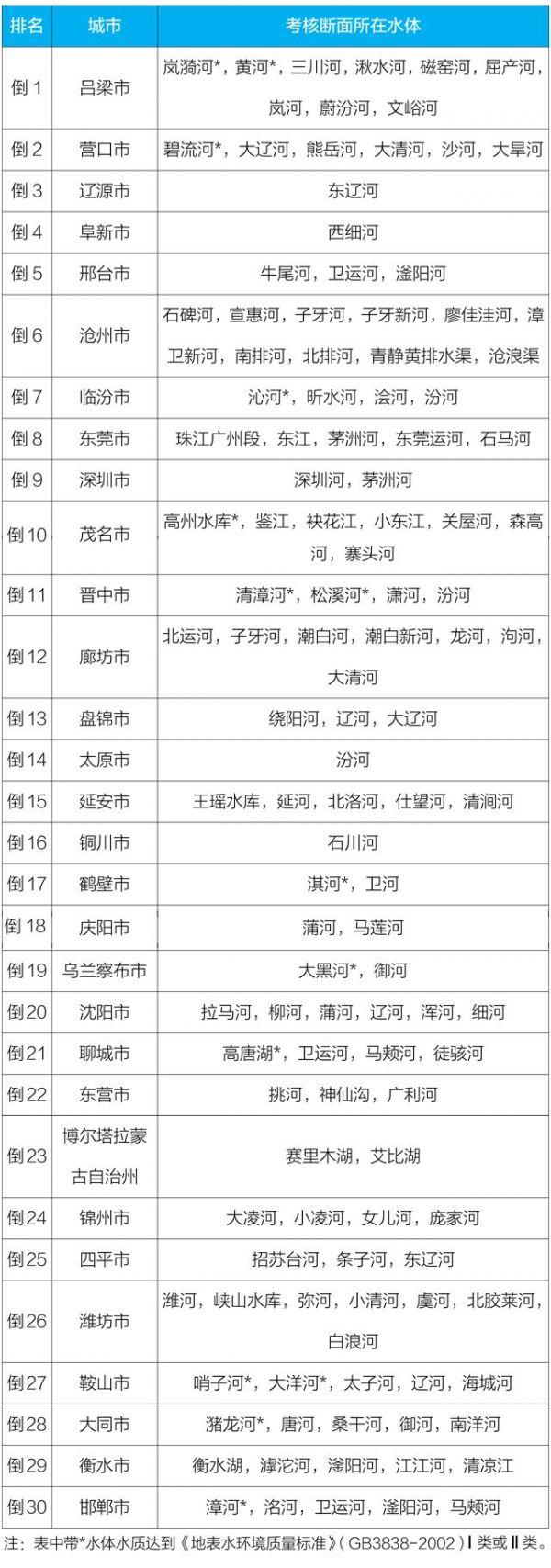 数据显示,上半年,吕梁、营口、辽源、阜新、邢台、沧州、临汾、东莞、深圳等30个城市国家地表水考核断面水环境质量相对较差(从倒数第1名到倒数第30名)。其中,吕梁、营口等城已持续垫底,吕梁更是多次排在倒数第一。
